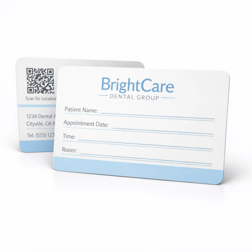 This product supports multiple card stocks and writable surfaces suitable for handwriting, stamping or marking appointment information. Cards may include business details, operating hours and instructions depending on artwork layout.